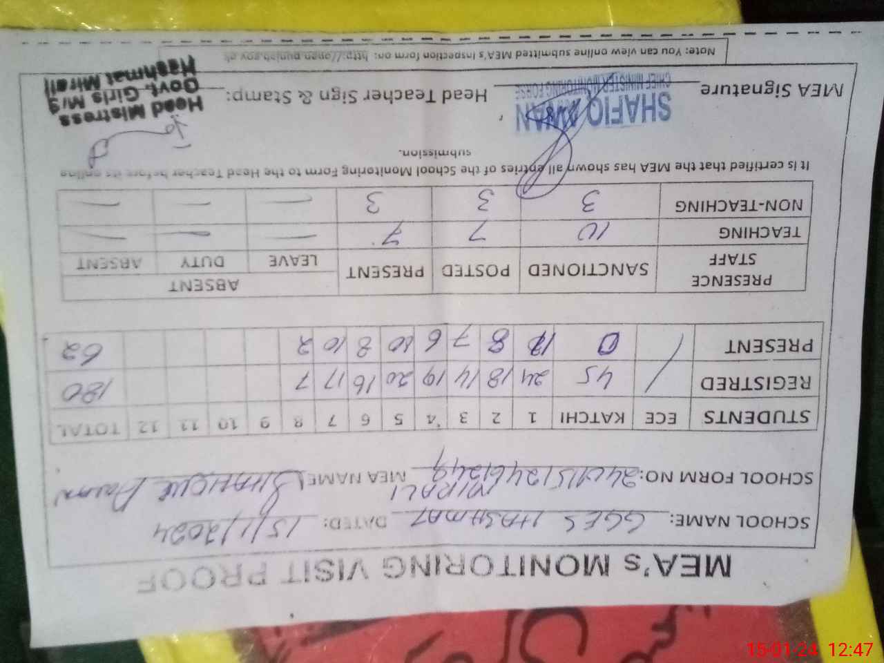 | Attendance Register | Head Teacher | MEA with School | Visit Proof |