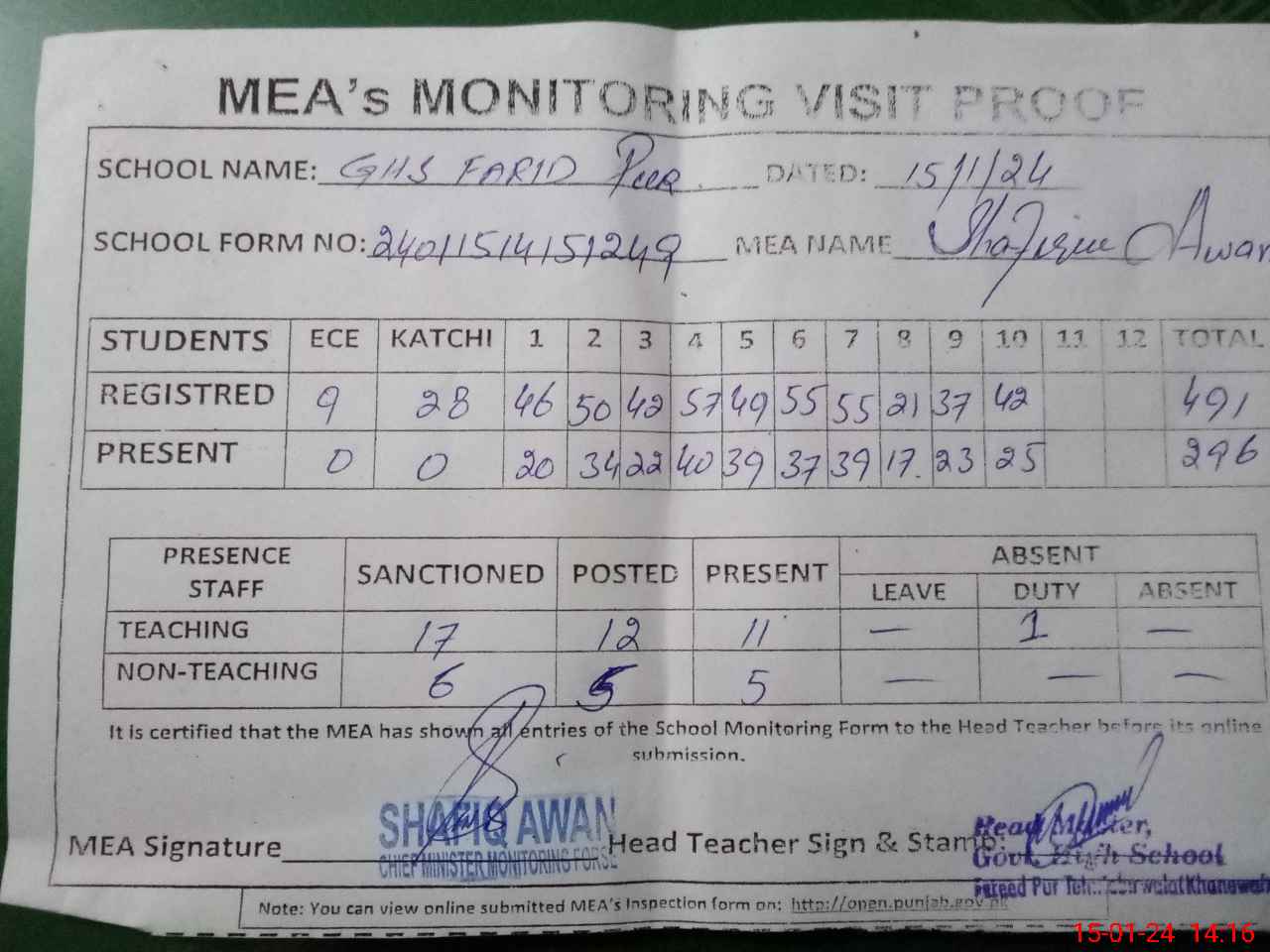 | EMIS Code: 36410059 | Name of School: GHS FARID PUR, SARAI SIDHU | |||