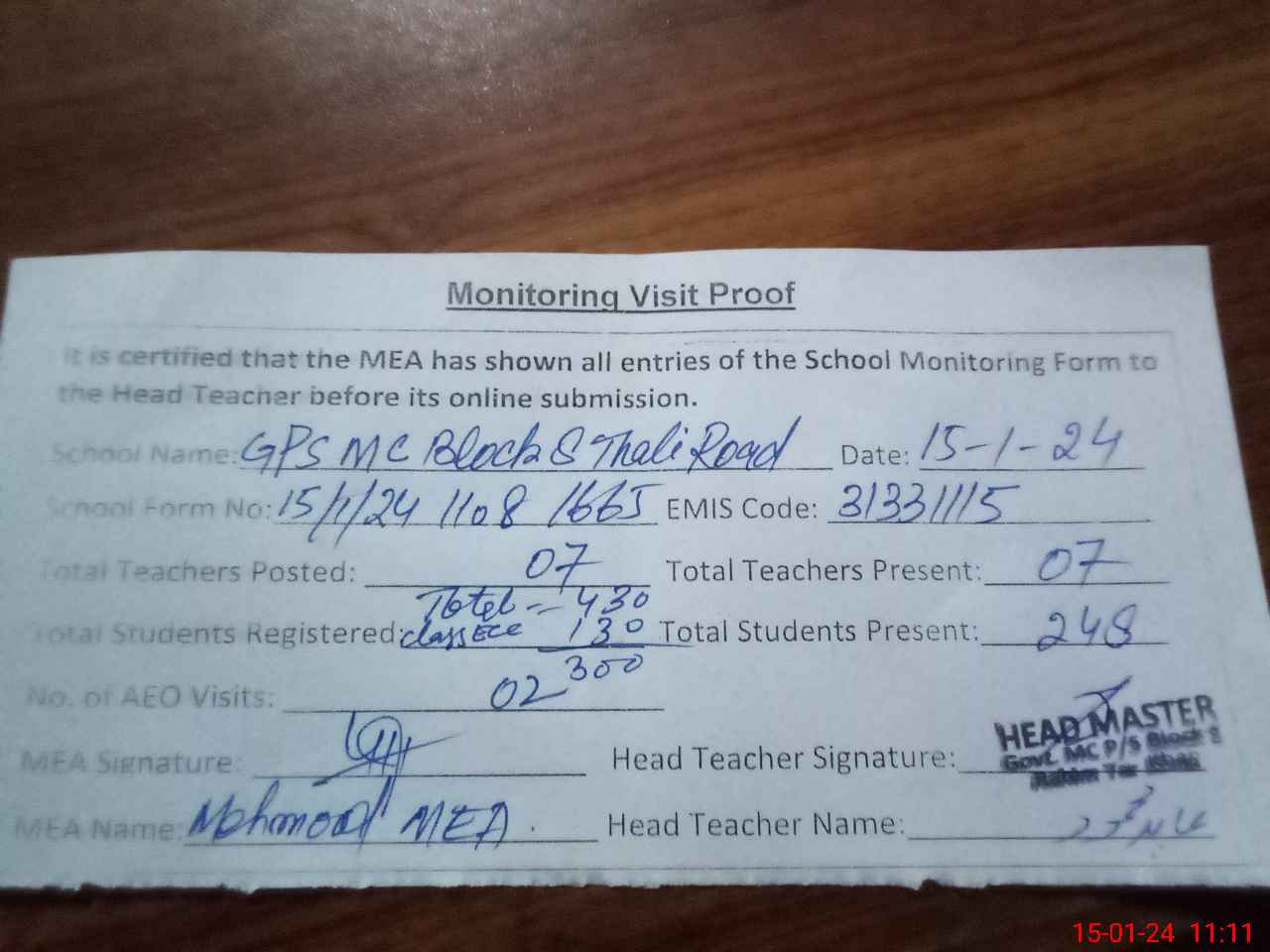 | EMIS Code: 31331115 | Name of School: GPS MC BLOCK NO. 8 THALI ROAD | |||