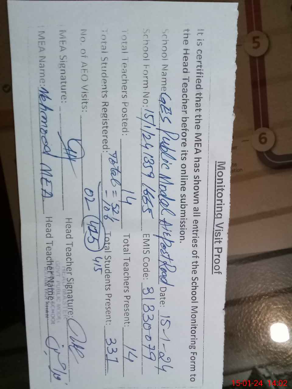 | Certified that this School was Inspected by the Undersigned MEA/DMO Today and the Information Stated Above is as Per Record. | |||||