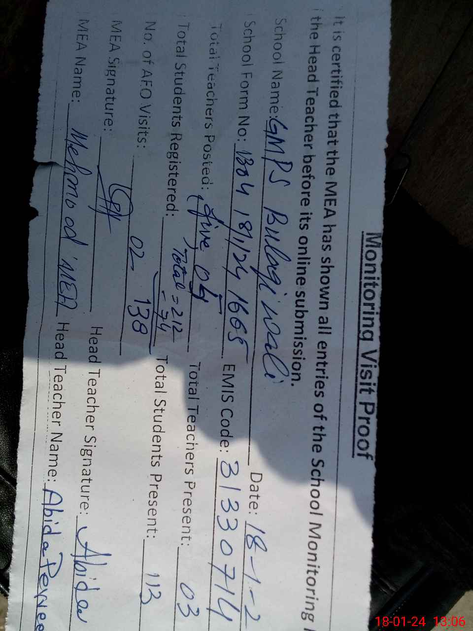 | Attendance Register | Head Teacher | MEA with School | Visit Proof |