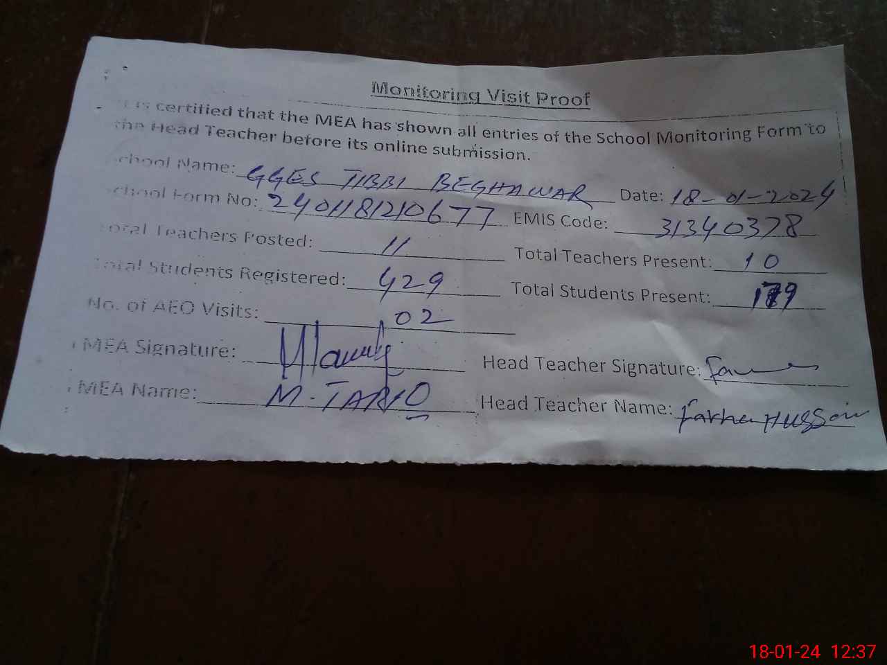 | Attendance Register | Head Teacher | MEA with School | Visit Proof |