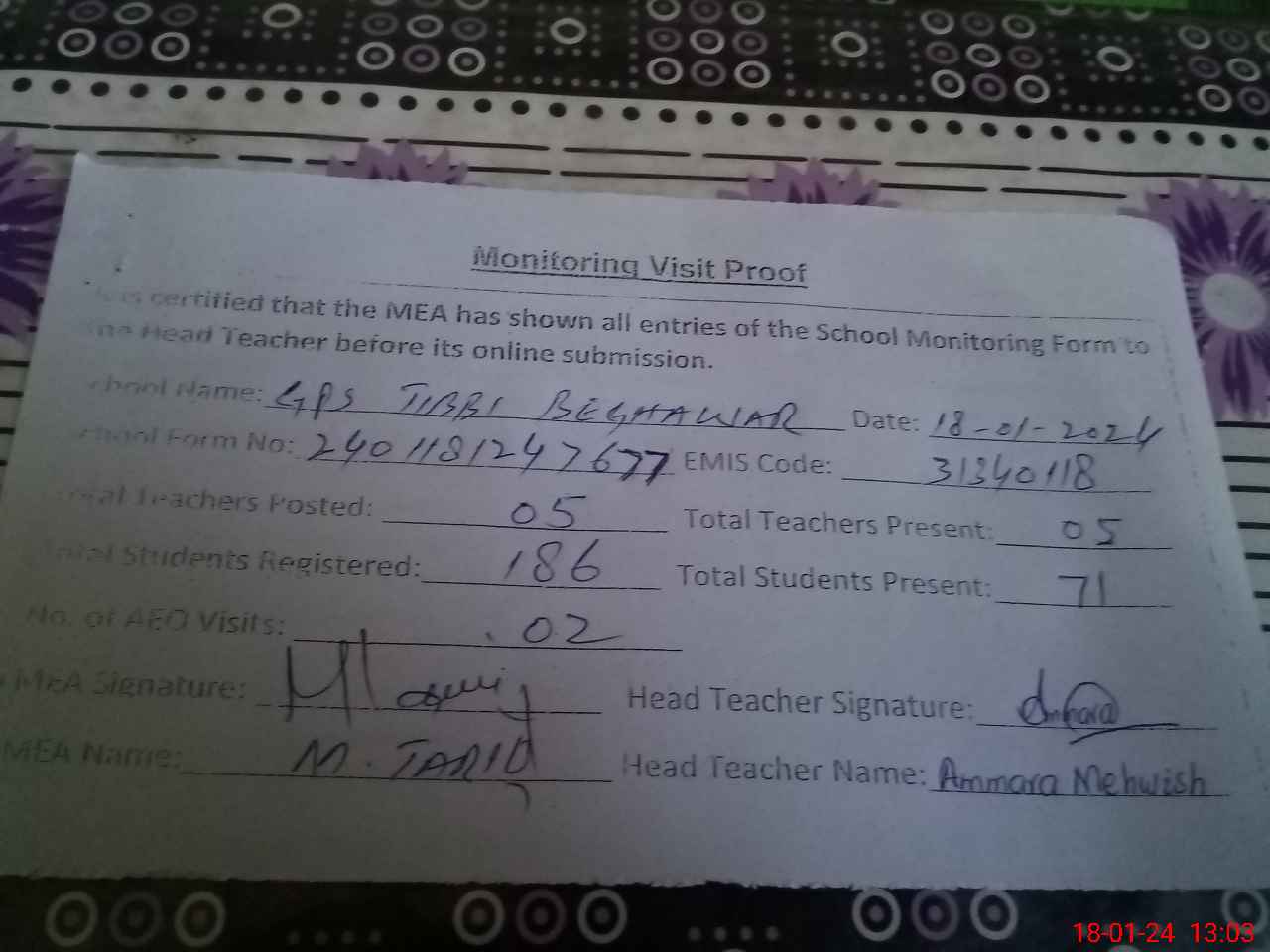 | Attendance Register | Head Teacher | MEA with School | Visit Proof |