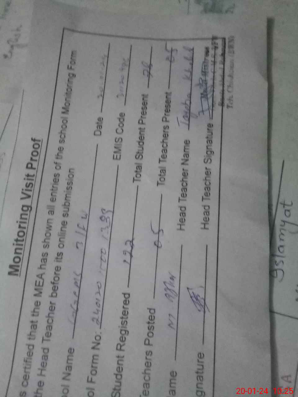 | Attendance Register | Head Teacher | MEA with School | Visit Proof |