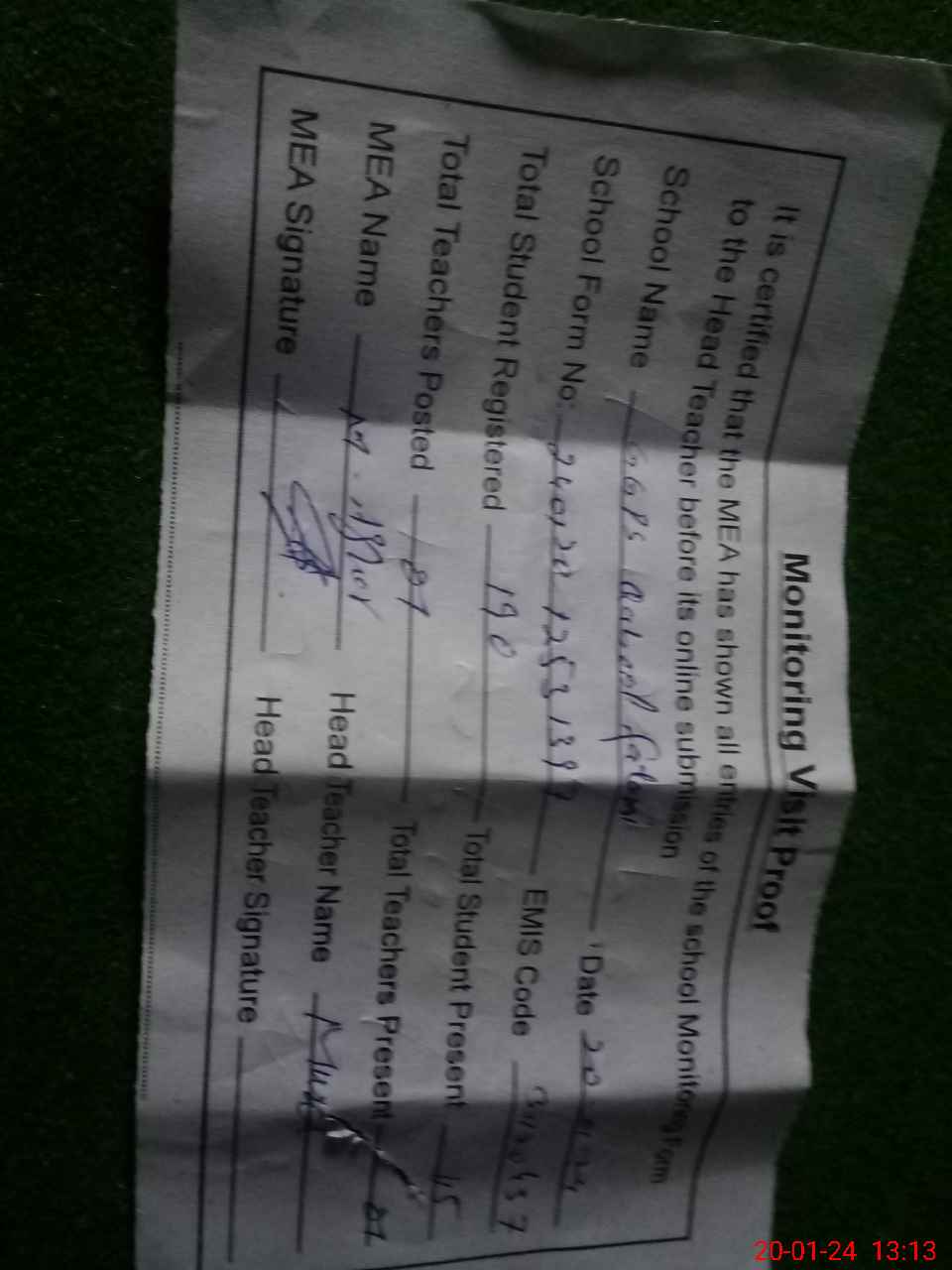 | Attendance Register | Head Teacher | MEA with School | Visit Proof |