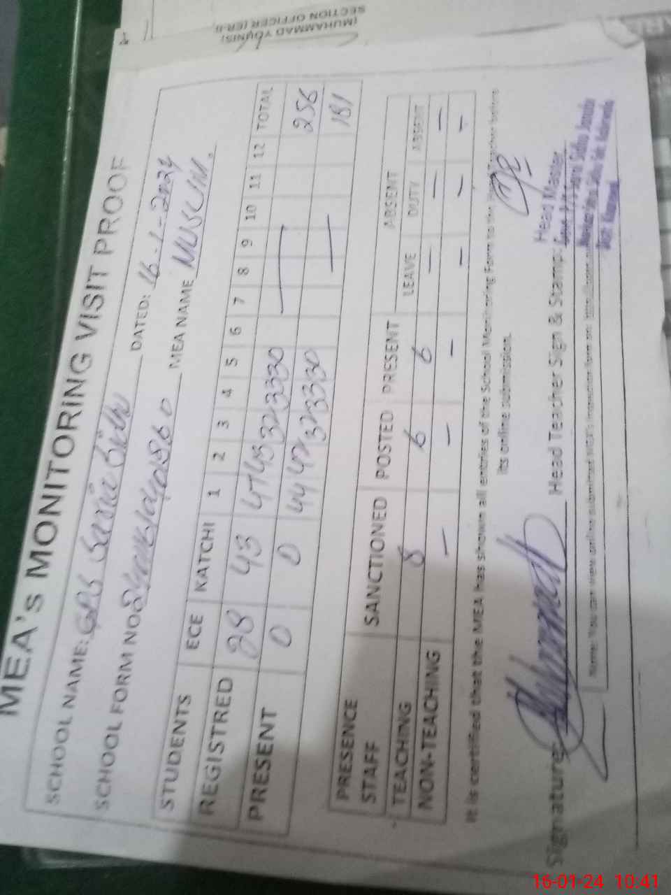 | Attendance Register | Head Teacher | MEA with School | Visit Proof |
