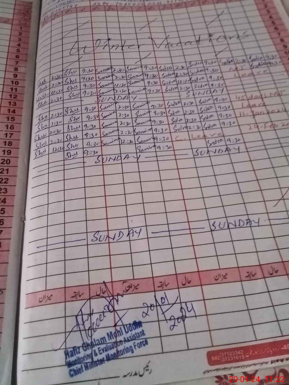 | CNIC | Full Name | Designation | R/C | Absence During Last Calender Month |