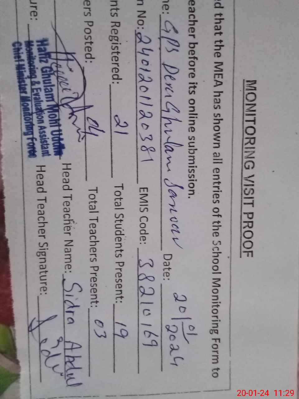 | Attendance Register | Head Teacher | MEA with School | Visit Proof |