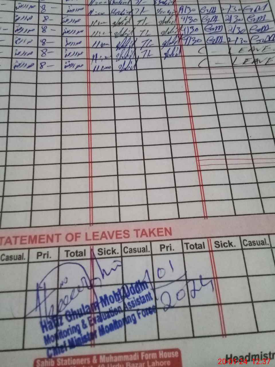 | CNIC | Full Name | Designation | R/C | Absence During Last Calender Month |