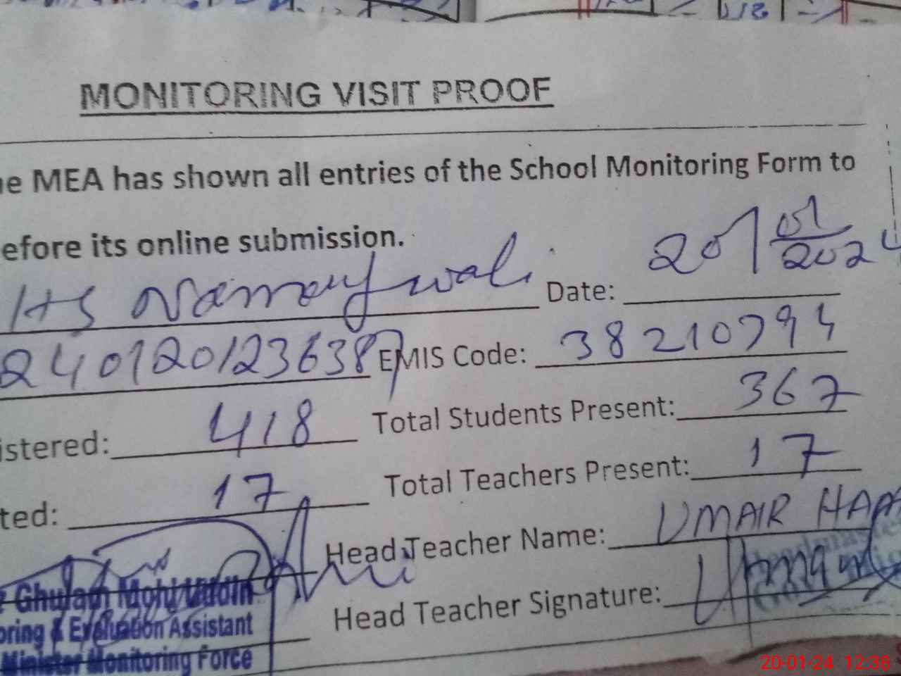 | Attendance Register | Head Teacher | MEA with School | Visit Proof |