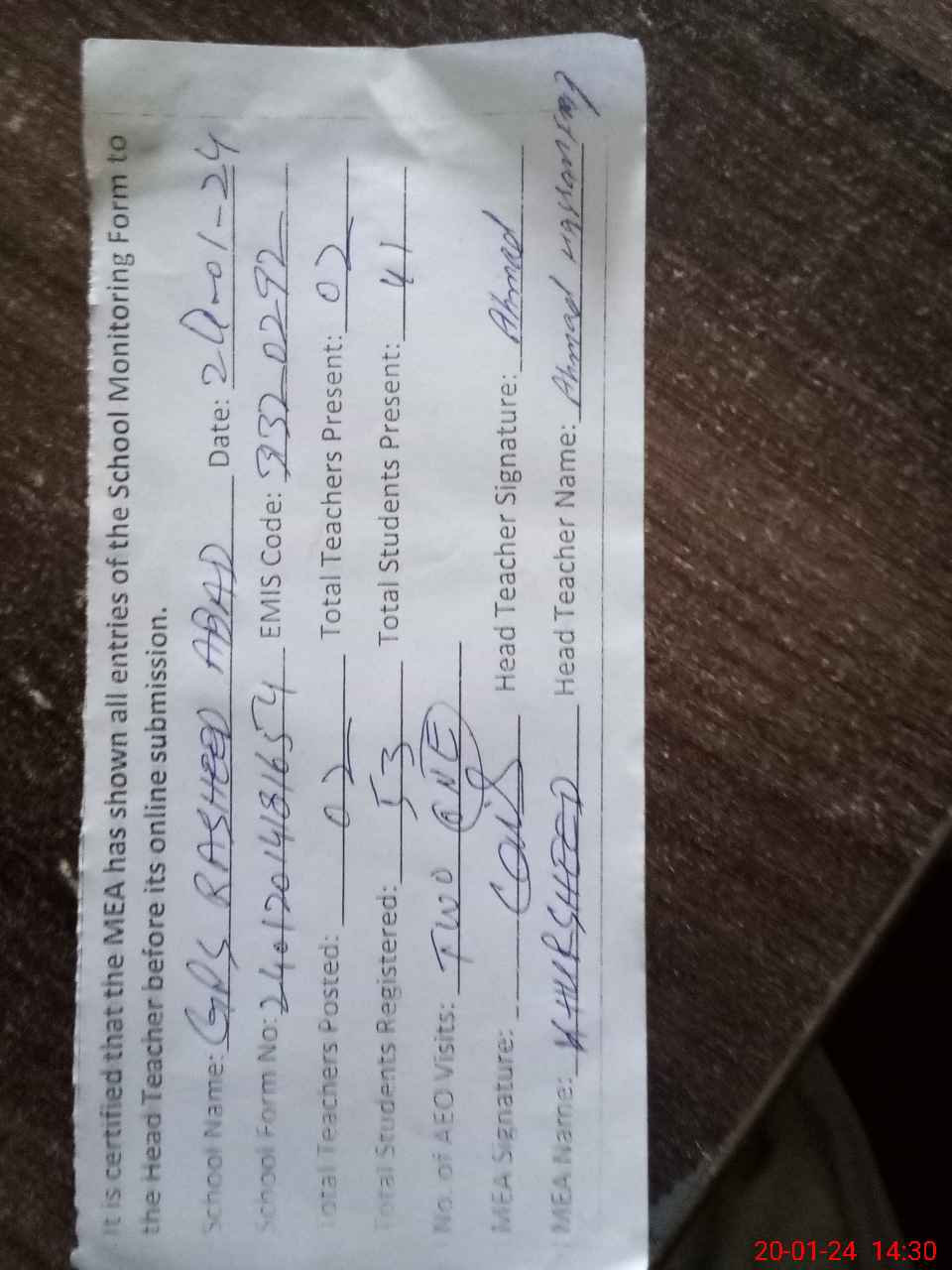 | Attendance Register | Head Teacher | MEA with School | Visit Proof |
