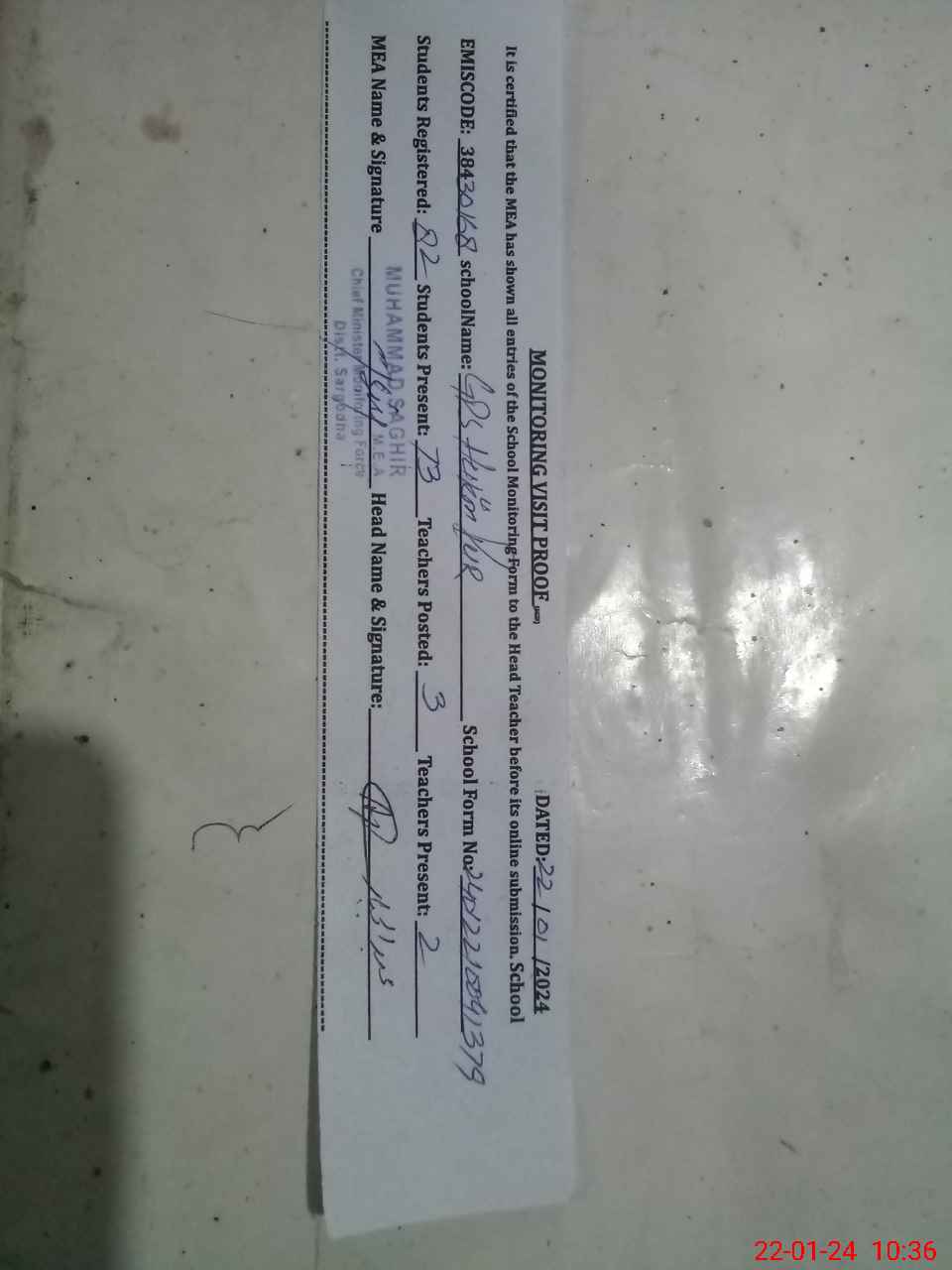 | Attendance Register | Head Teacher | MEA with School | Visit Proof |