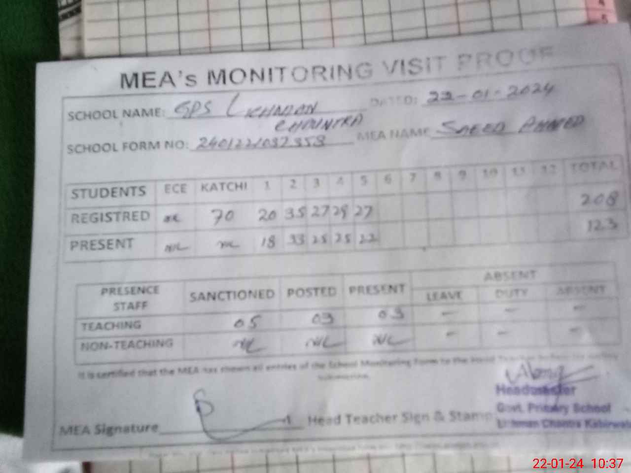 | Attendance Register | Head Teacher | MEA with School | Visit Proof |