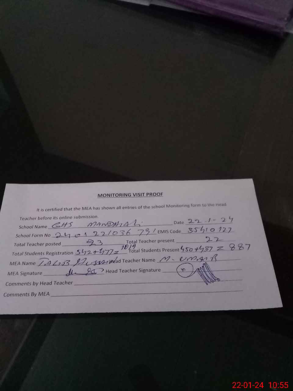 | Attendance Register | Head Teacher | MEA with School | Visit Proof |
