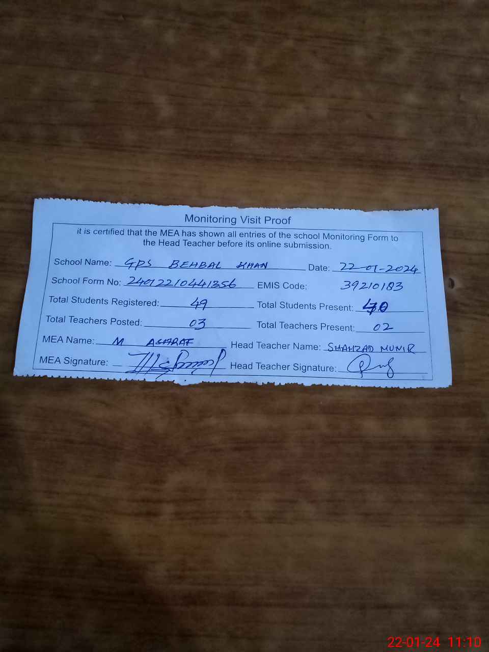 | Attendance Register | Head Teacher | MEA with School | Visit Proof |