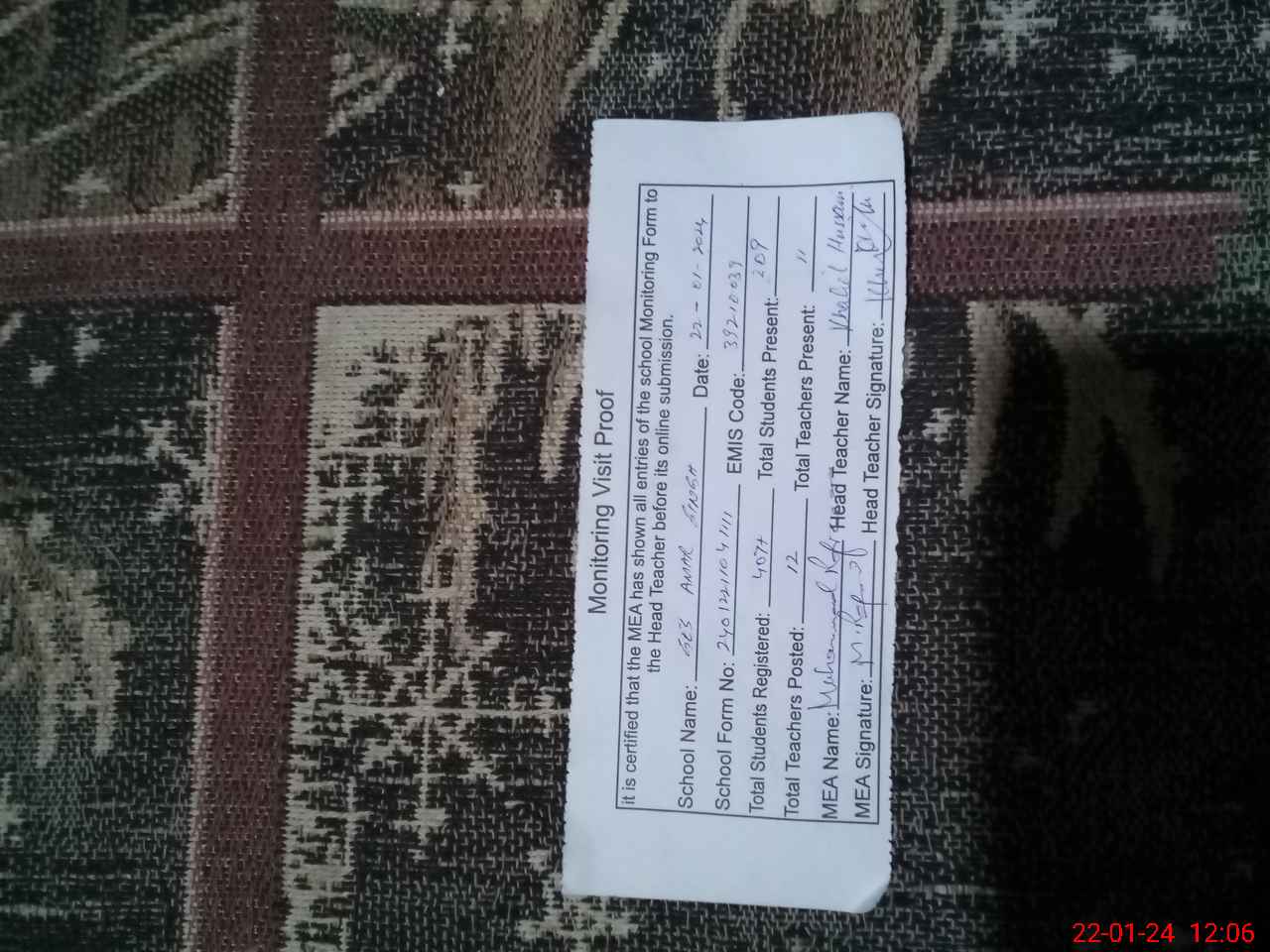 | Attendance Register | Head Teacher | MEA with School | Visit Proof |
