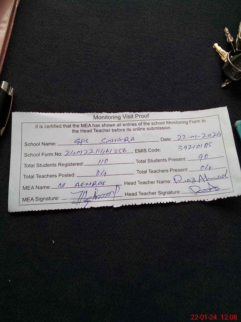 | Attendance Register | Head Teacher | MEA with School | Visit Proof |