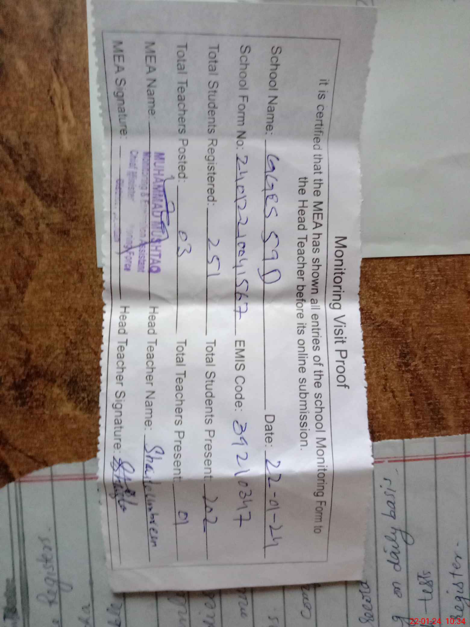 | Attendance Register | Head Teacher | MEA with School | Visit Proof |
