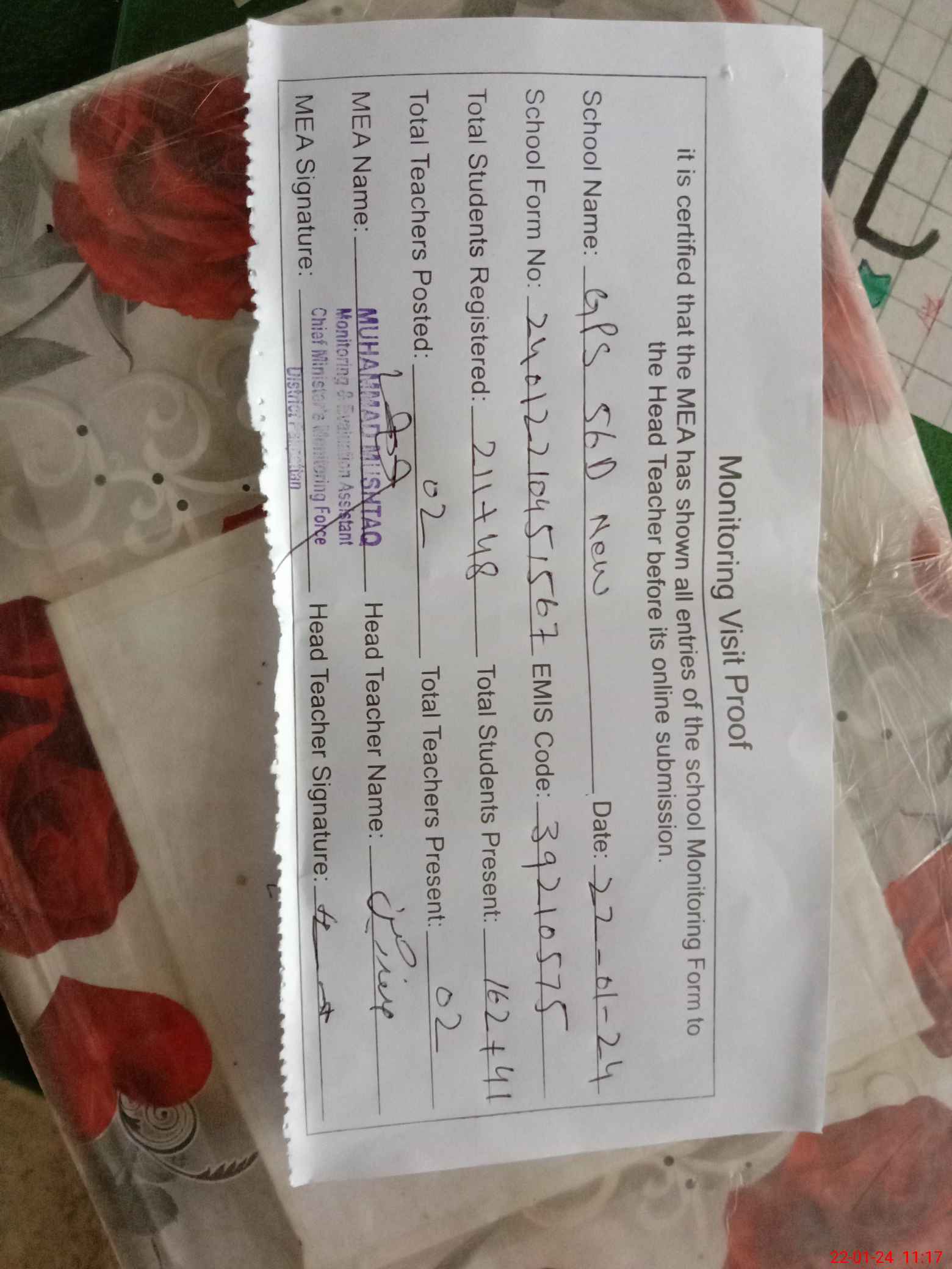 | Certified that this School was Inspected by the Undersigned MEA/DMO Today and the Information Stated Above is as Per Record. | |||||