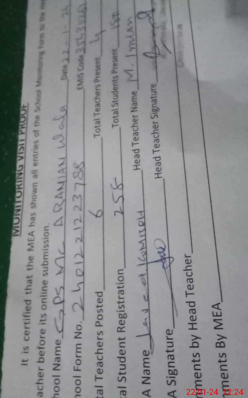 | Name: Mu**** Im**** Designation: (School Headmaster's/Headmistress's) PST Phone/Cell Number: 03**** |