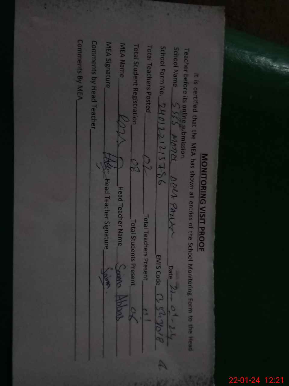 | Attendance Register | Head Teacher | MEA with School | Visit Proof |
