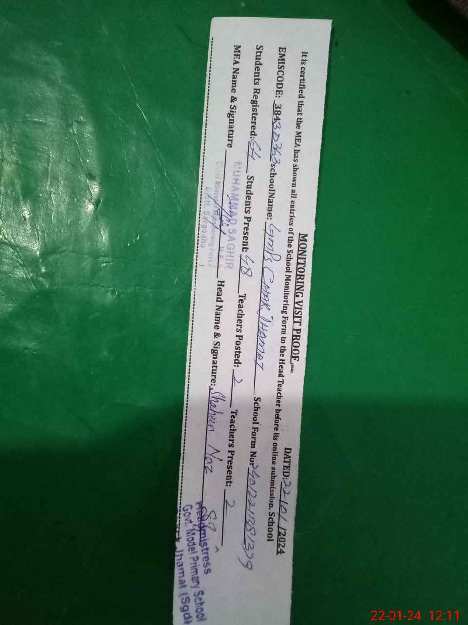 | Attendance Register | Head Teacher | MEA with School | Visit Proof |
