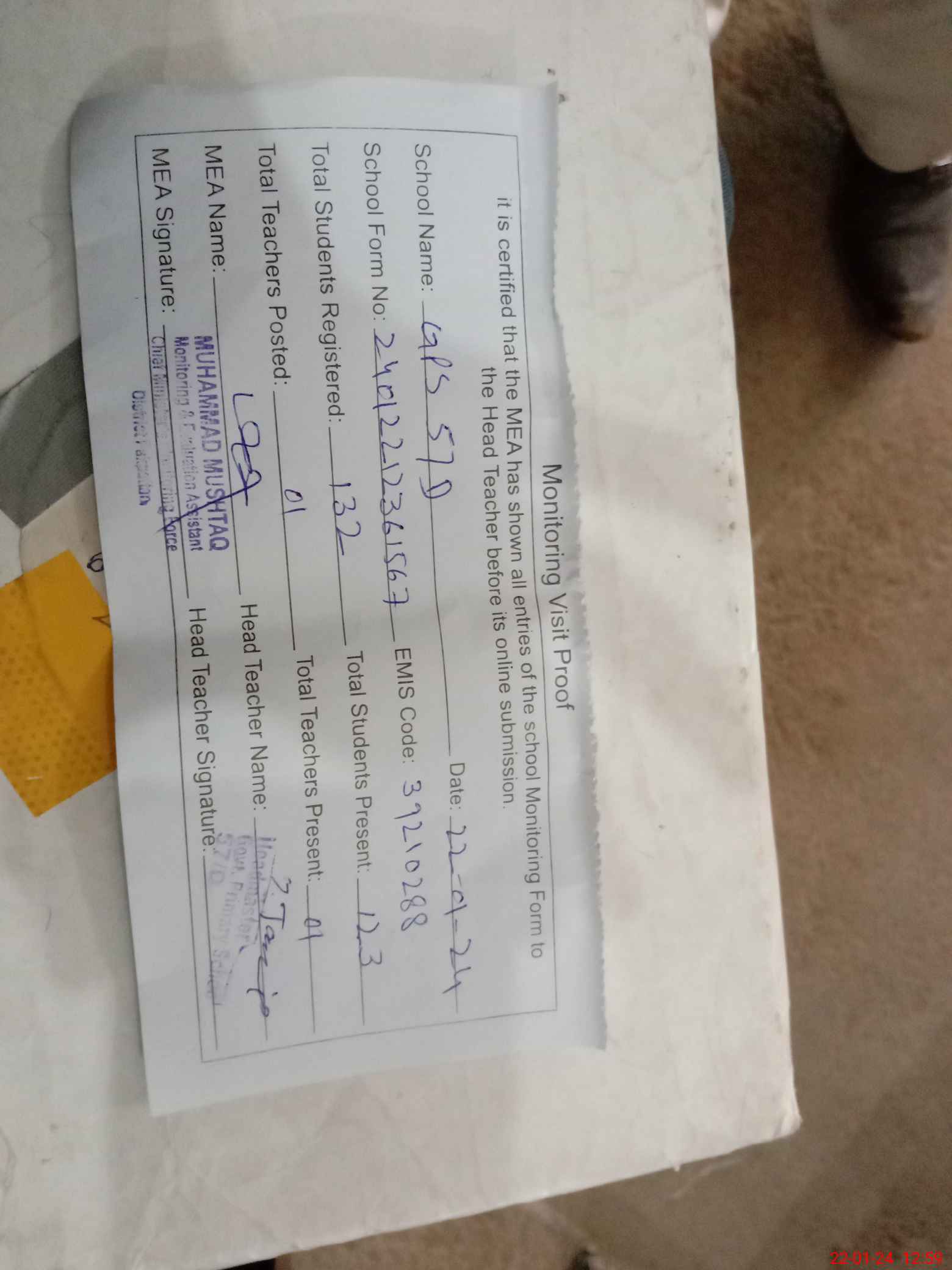 | Attendance Register | Head Teacher | MEA with School | Visit Proof |