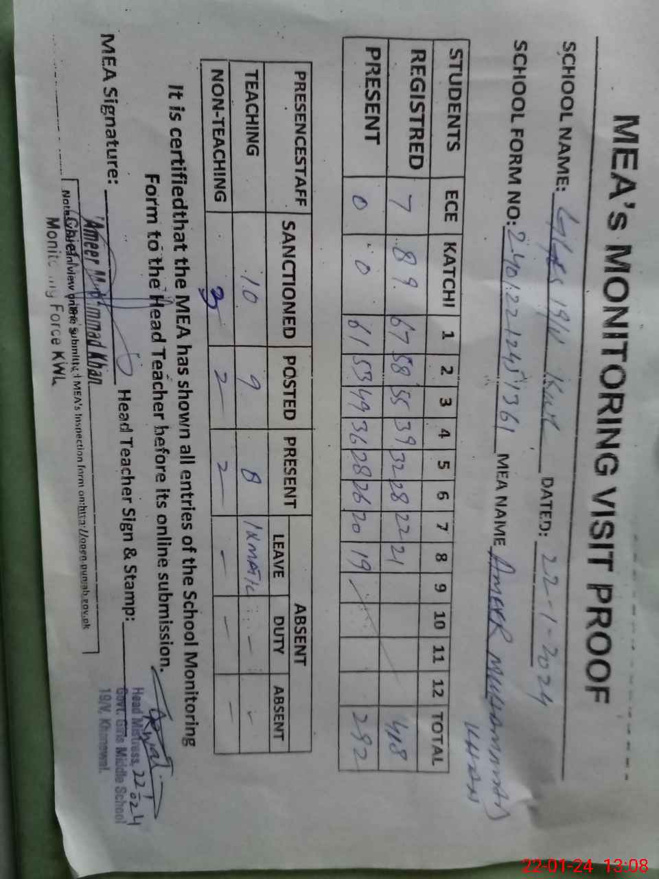 | Attendance Register | Head Teacher | MEA with School | Visit Proof |