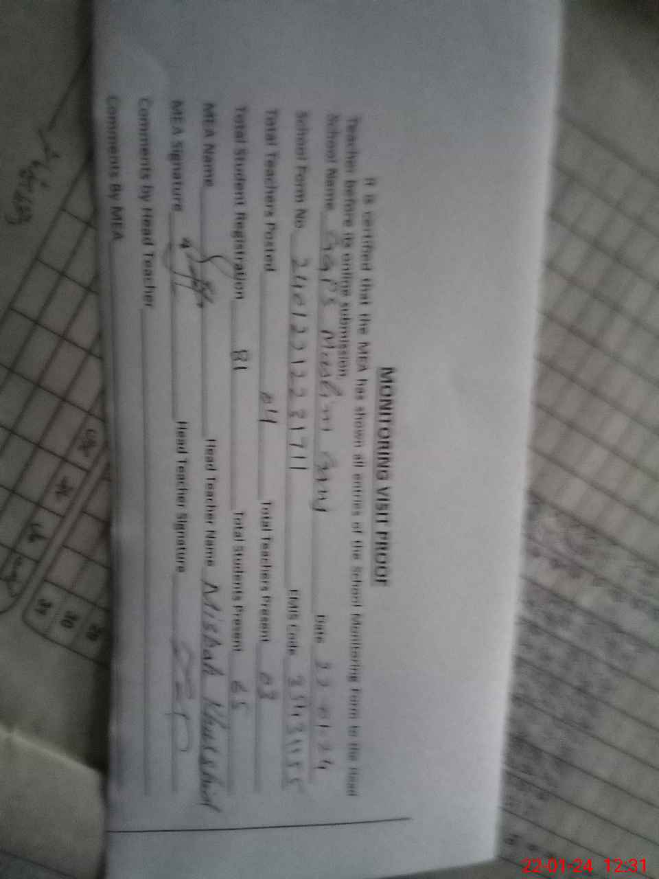 | Attendance Register | Head Teacher | MEA with School | Visit Proof |
