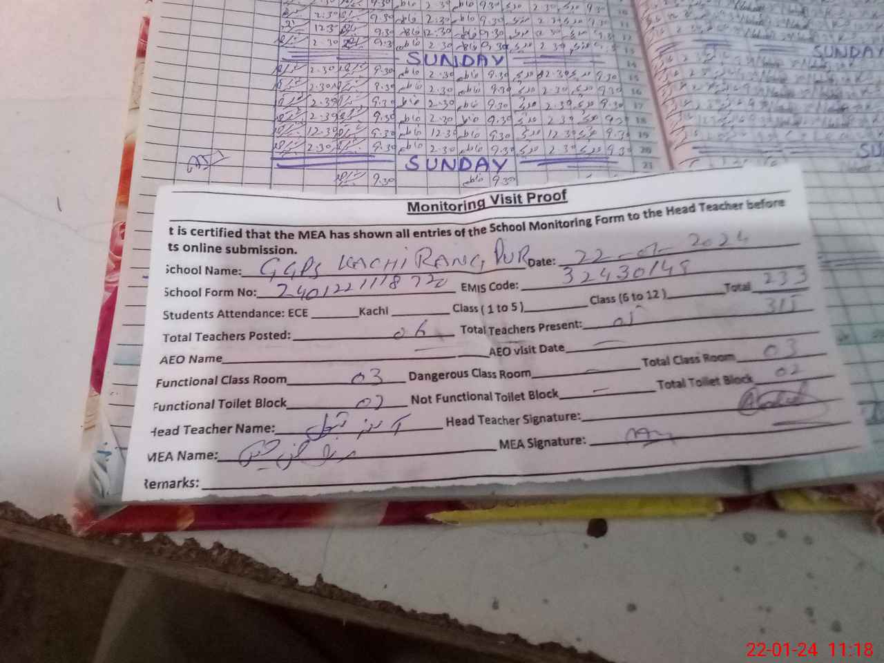 | Attendance Register | Head Teacher | MEA with School | Visit Proof |