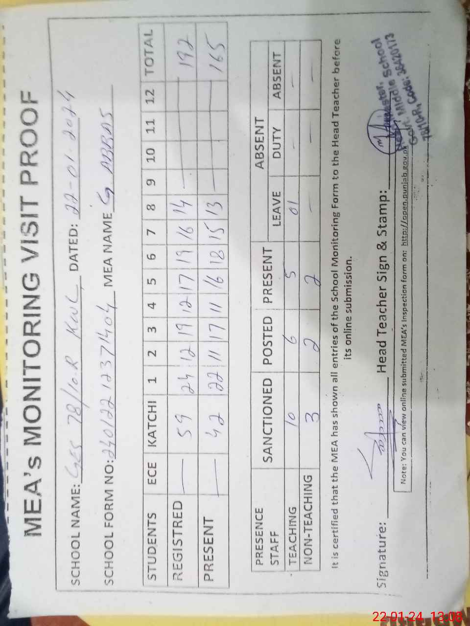 | Certified that this School was Inspected by the Undersigned MEA/DMO Today and the Information Stated Above is as Per Record. | |||||