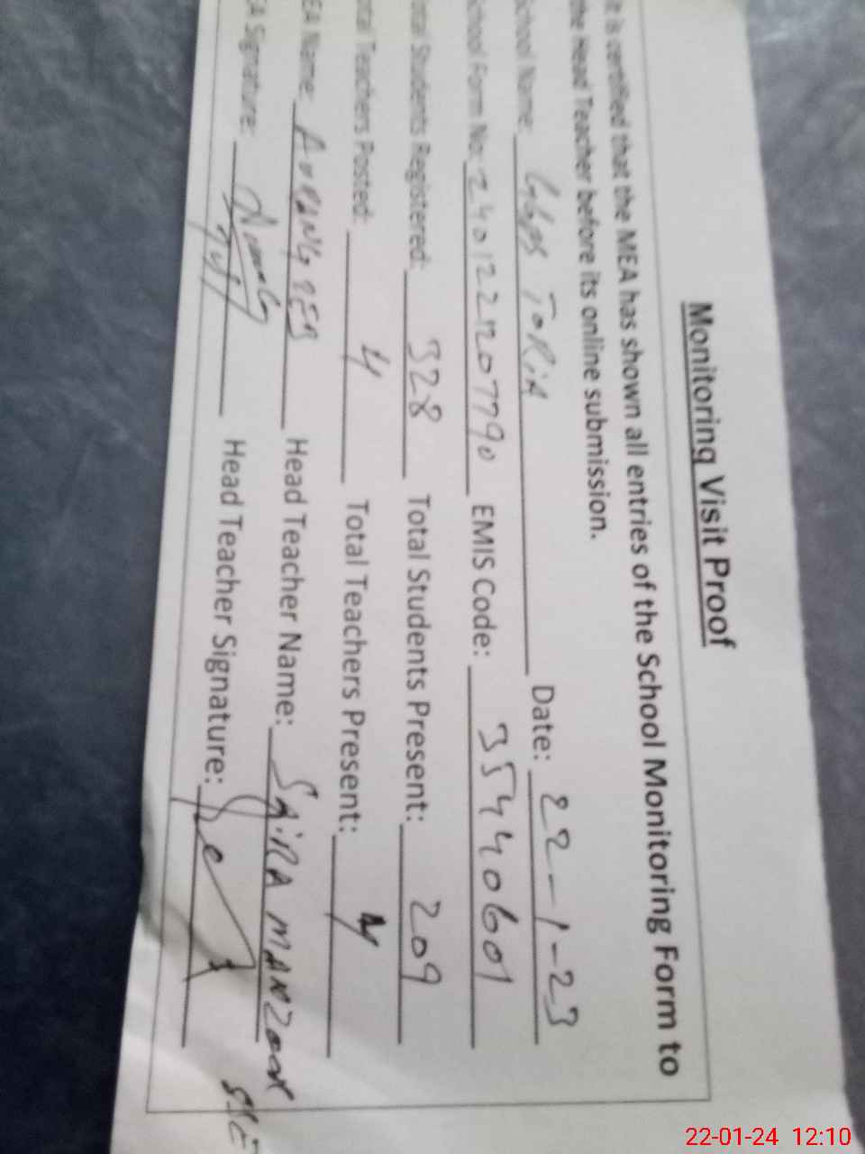 | Attendance Register | Head Teacher | MEA with School | Visit Proof |