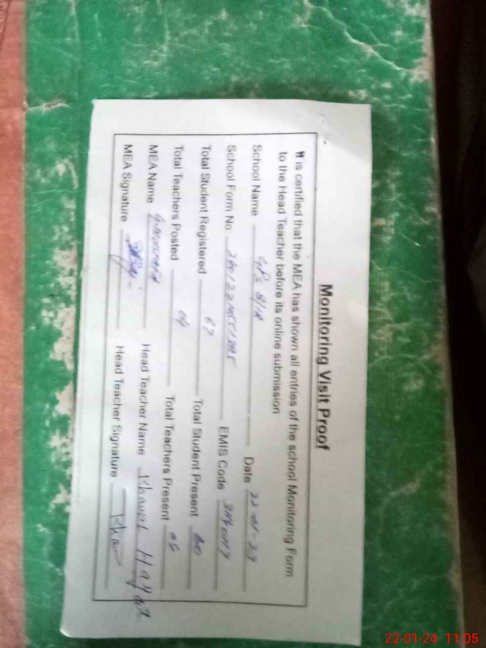 | Attendance Register | Head Teacher | MEA with School | Visit Proof |