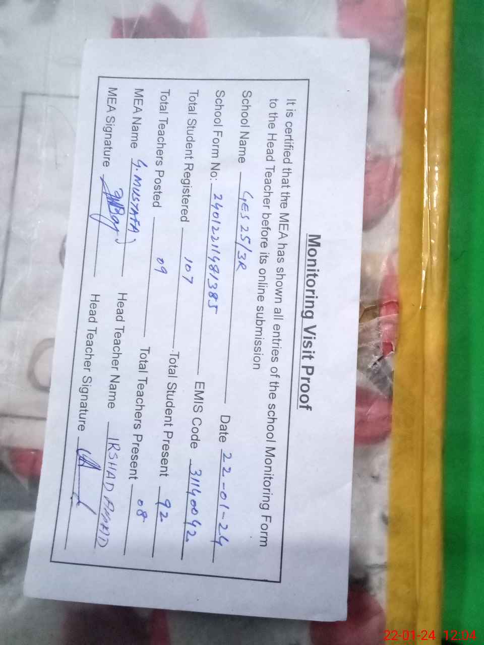 | EMIS Code: 31140042 | Name of School: GES CHAK NO. 25/3-R | |||
