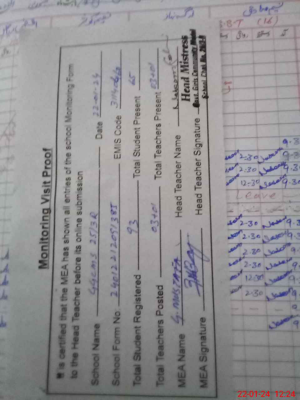 | Attendance Register | Head Teacher | MEA with School | Visit Proof |
