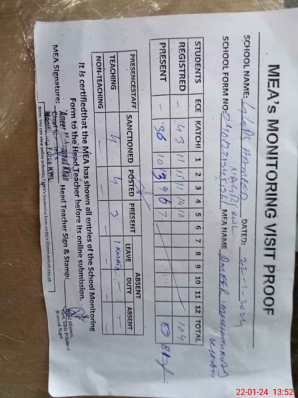 | Attendance Register | Head Teacher | MEA with School | Visit Proof |