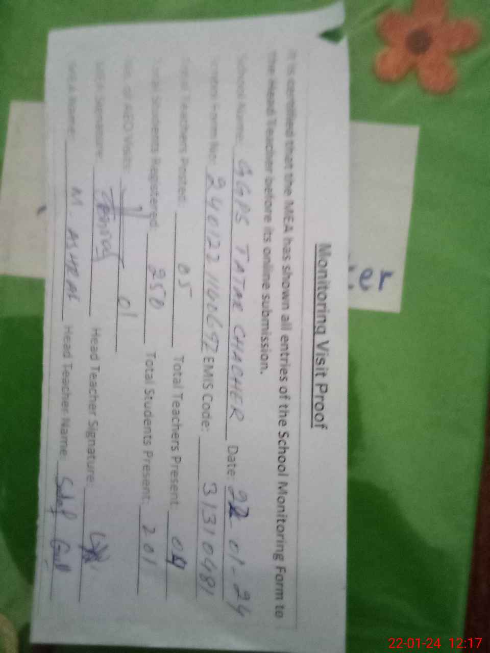 | Attendance Register | Head Teacher | MEA with School | Visit Proof |