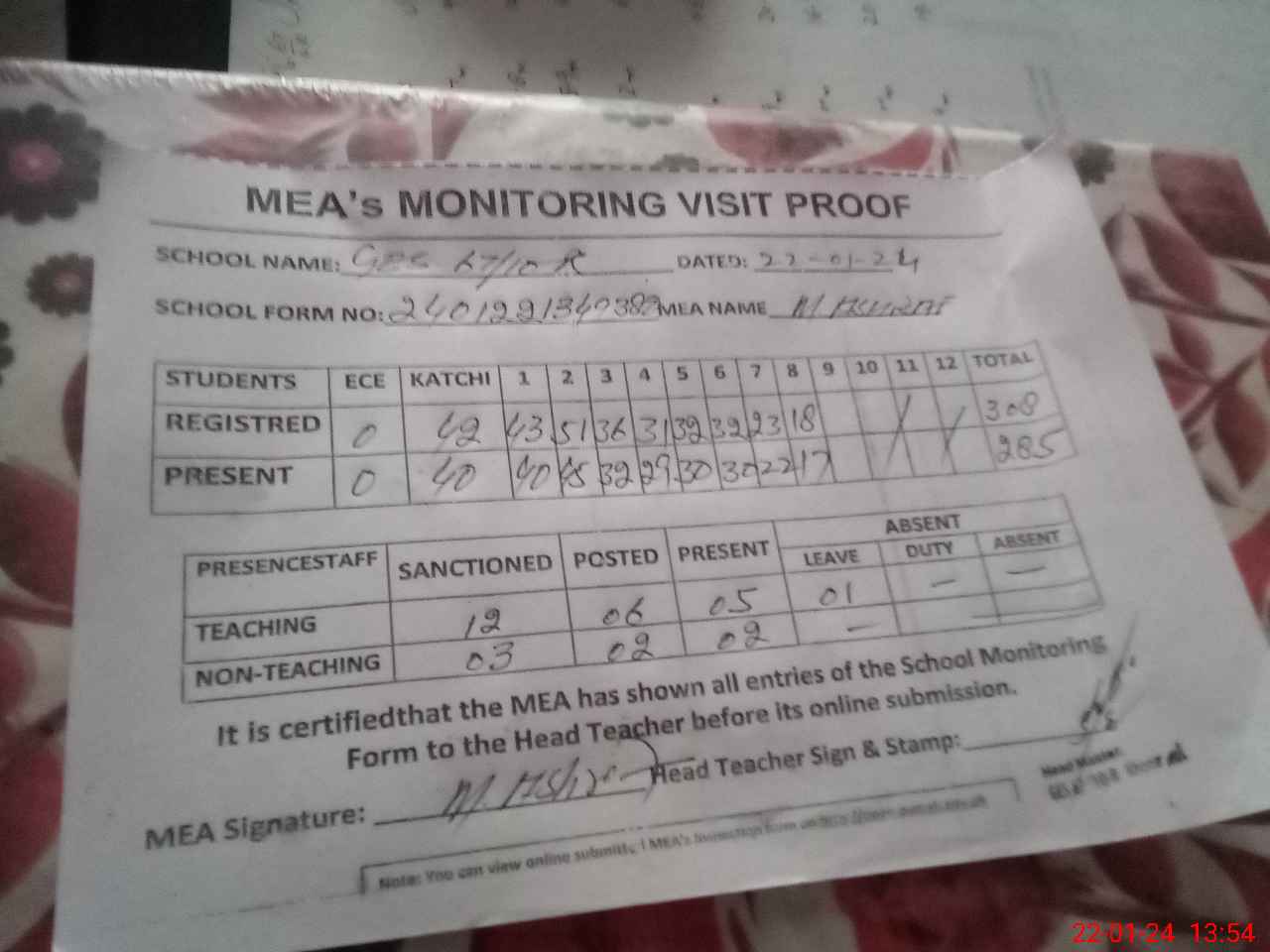 | Attendance Register | Head Teacher | MEA with School | Visit Proof |