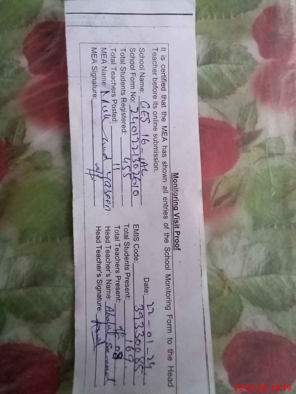 | Attendance Register | Head Teacher | MEA with School | Visit Proof |