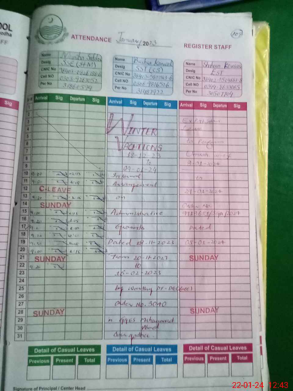 | CNIC | Full Name | Designation | R/C | Absence during last cal. month |