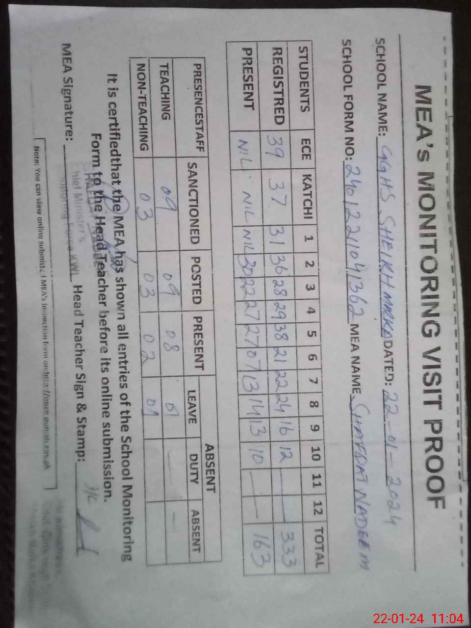 | Attendance Register | Head Teacher | MEA with School | Visit Proof |