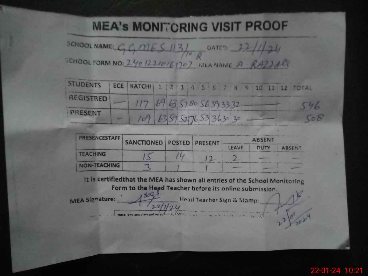 | Attendance Register | Head Teacher | MEA with School | Visit Proof |