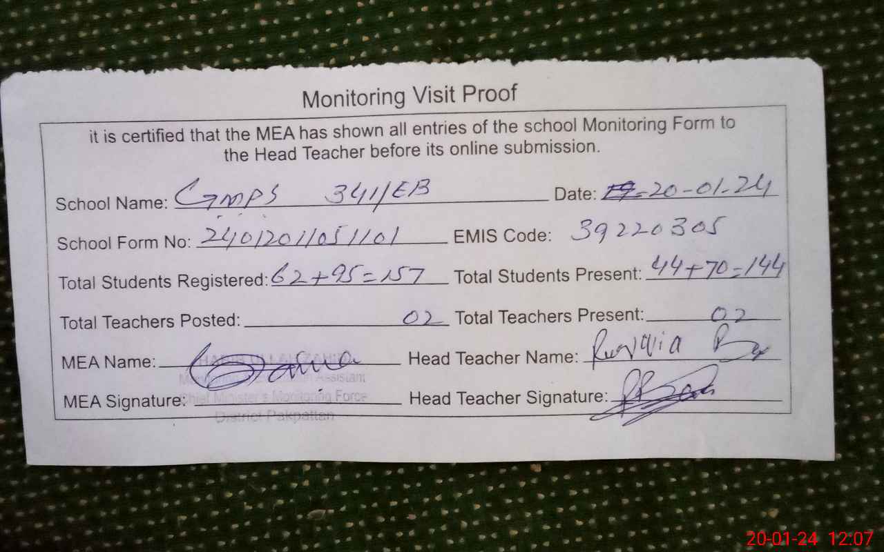 | Attendance Register | Head Teacher | MEA with School | Visit Proof |
