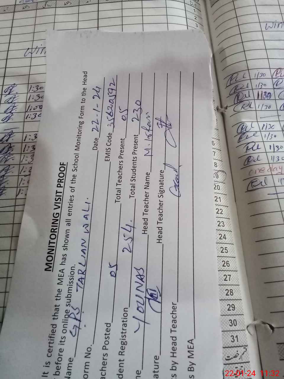 | Attendance Register | Head Teacher | MEA with School | Visit Proof |