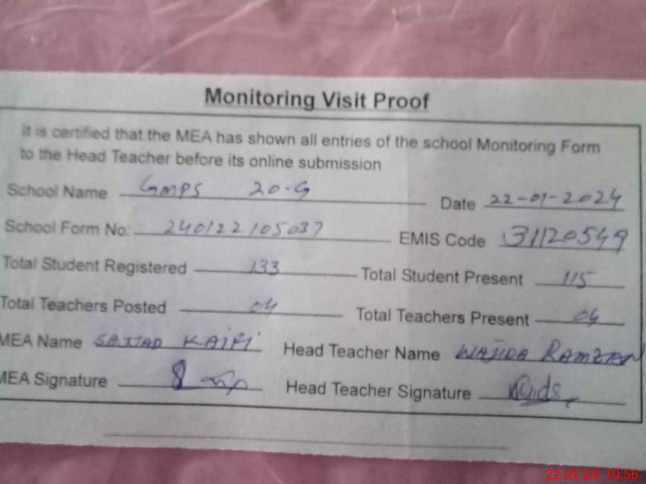 | EMIS Code: 31120549 | Name of School: GMPS CHAK NO. 20/G | |||