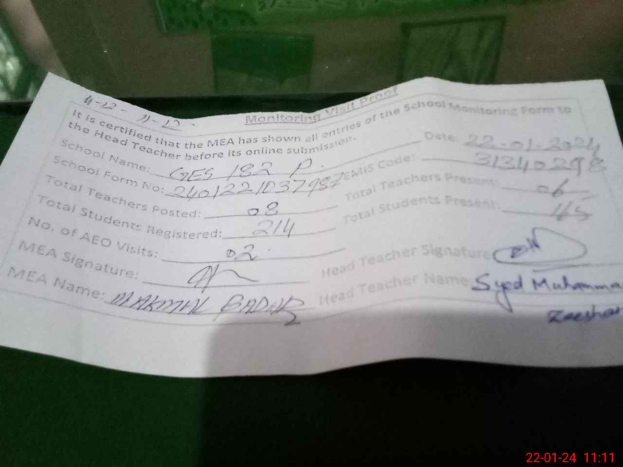 | EMIS Code: 31340298 | Name of School: GES CHAK NO. 182/P | |||