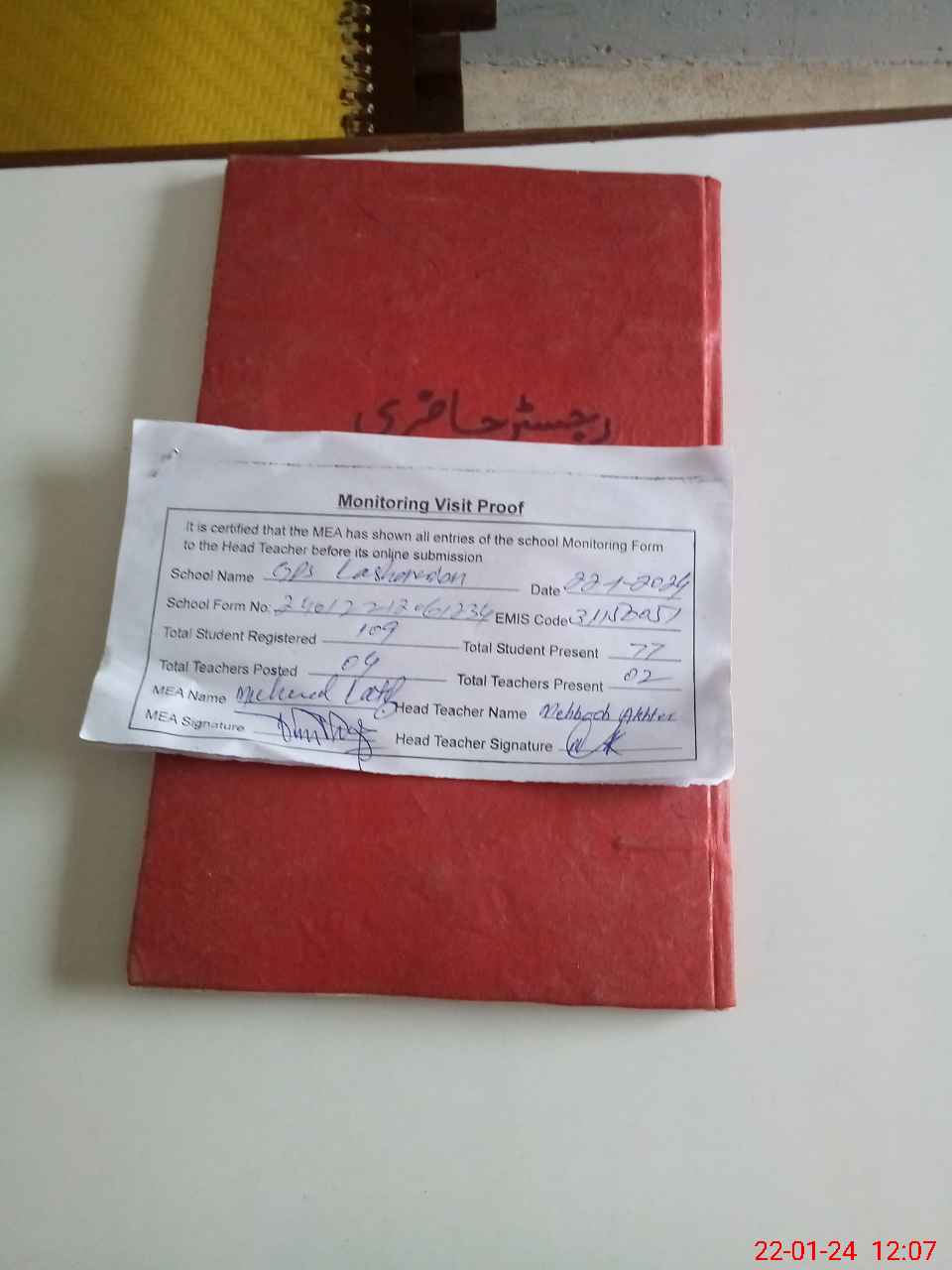 | Attendance Register | Head Teacher | MEA with School | Visit Proof |