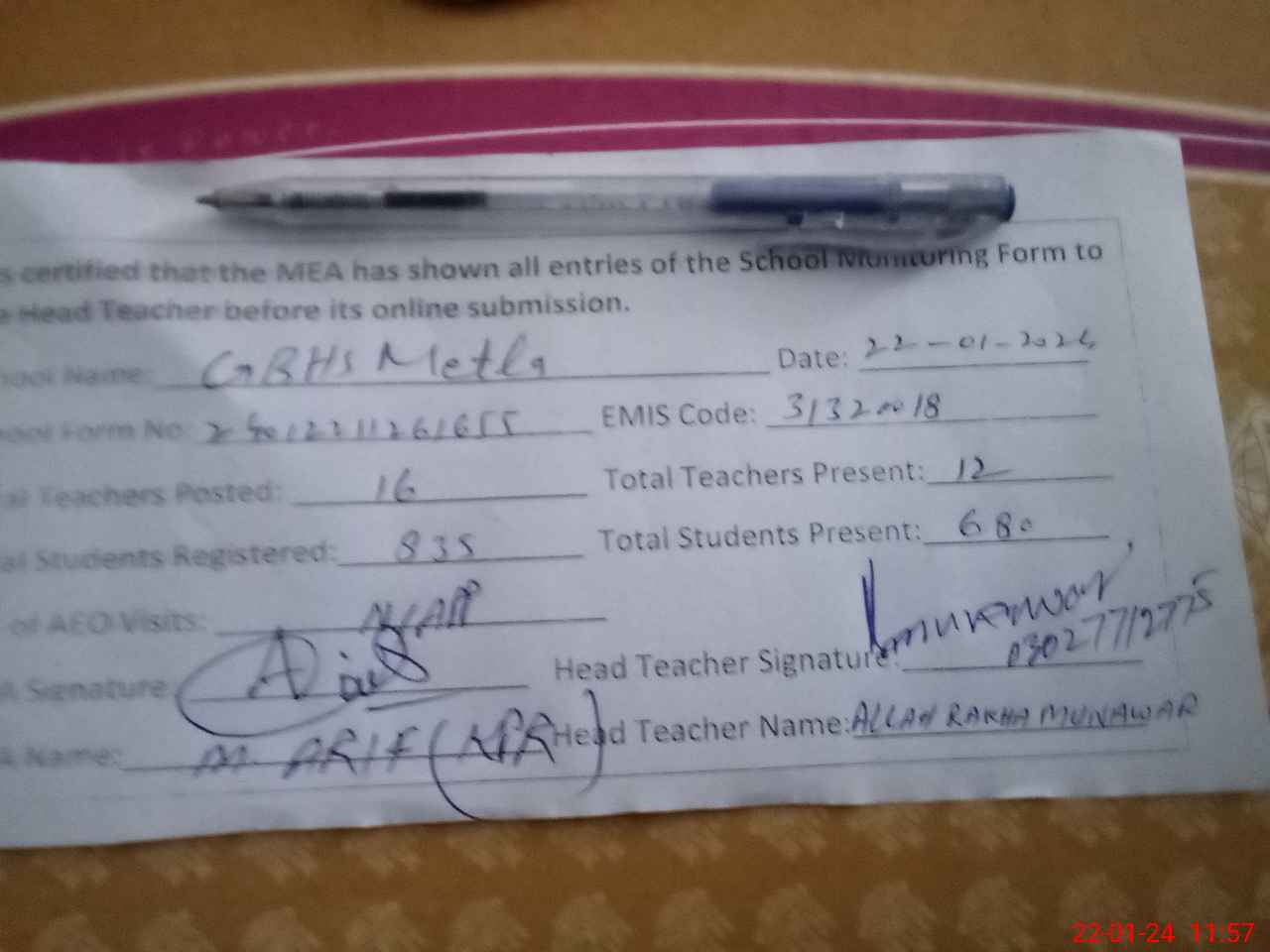 | Name: AL**** RA**** MU**** Designation: (School Headmaster's/Headmistress's) S H M Phone/Cell Number: 03**** |