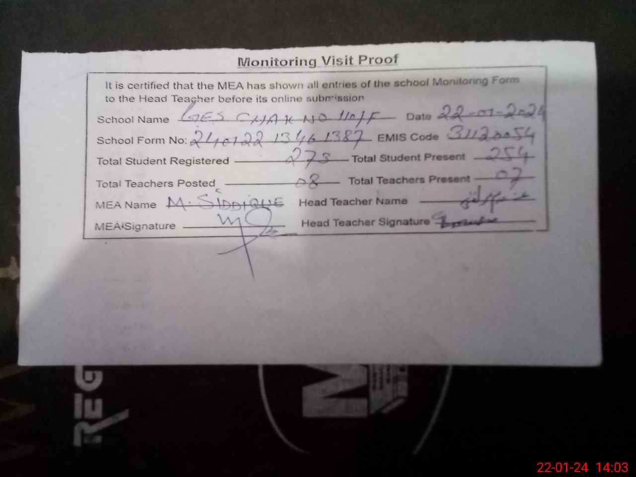 | Attendance Register | Head Teacher | MEA with School | Visit Proof |
