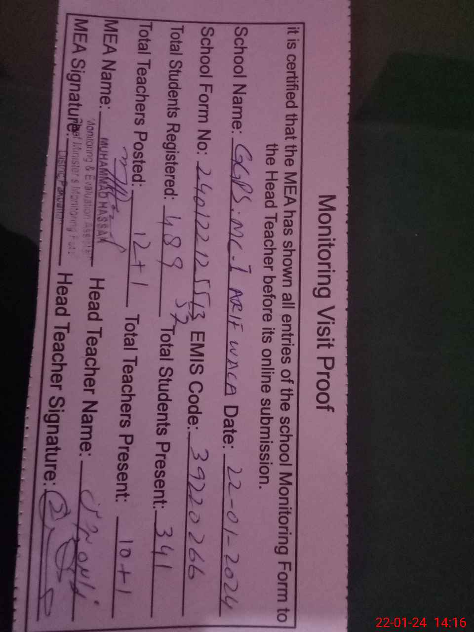 | Attendance Register | Head Teacher | MEA with School | Visit Proof |